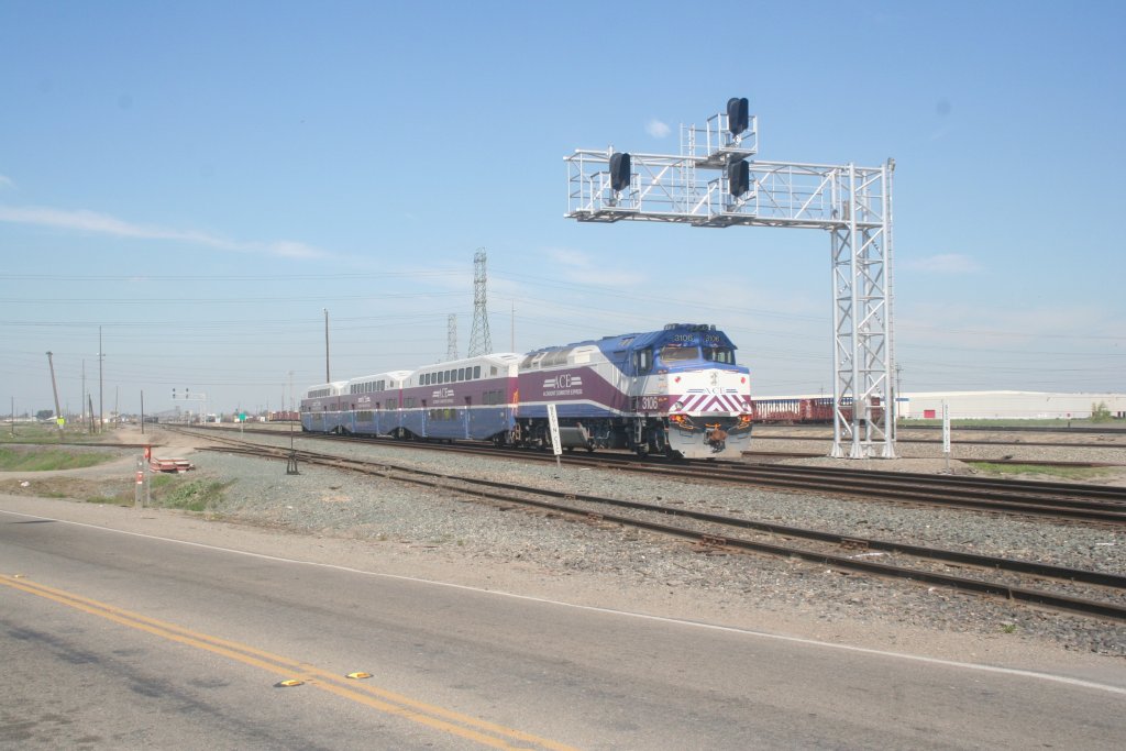 Altamont Commuter Express Train 2,Eastbound, just enters the CTC point at the south end of the former SP Stockton Yard.