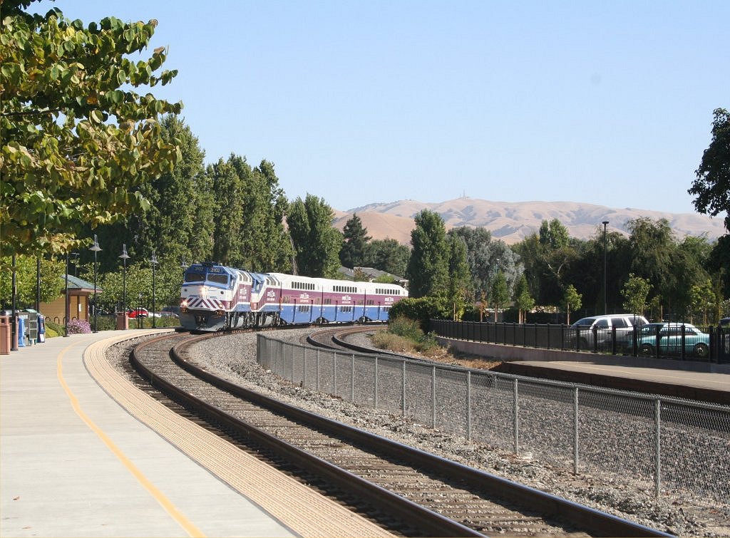 ACE Train 7 approaches the Centerville District Station in Fremont, Calif
